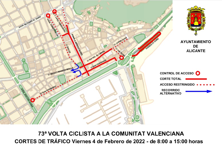 Para celebrar la salida de la tercera etapa ciclista es necesario el cierre al tráfico de la Plaza del Ayuntamiento, a partir de las seis de la madrugada, del viernes 4 de febrero hasta final de desmontaje, previsto a las 15 horas. La calle Rafael Altamira y Rambla Méndez Núñez, en el tramo comprendido entre Alfonso X el Sabio y la Explanada, se va a cortar de 8 a 15 horas. La calle Jorge Juan, se permitirá el acceso para garantizar la entrada de los residentes al barrio por la calle Lonja de Caballeros y Virgen del Socorro.