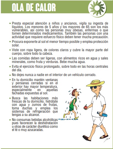 Dentro de los consejos se recomienda a los ciudadanos beber agua y estar hidratados, reducir el ejercicio físico, vestir ropa ligera, resguardarse del sol, prestar especial atención a niños y ancianos, permanecer en habitaciones frescas, y cerrar las ventanas y cortinas expuestas al sol.Por su parte se recomienda que, ante síntomas como sensación de debilidad, mareos, calambres musculares, dolor de cabeza, náuseas, frecuentes en casos de agotamiento por calor, cesar la actividad, beber líquidos, refrescar el cuerpo y consultar con los servicios sanitarios, incluso avisar al servicio de urgencias sanitarias si los síntomas no disminuyen.