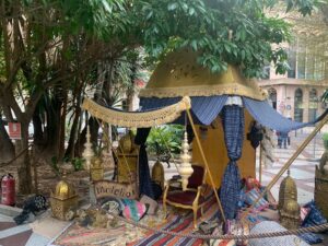 Tres jaimas tematizadas y ornamentadas, en cuyo interior se sitúan otros tantos tronos, ocupan el espacio central del recinto. Éste, y en las áreas próximas a las zonas verdes de la Plaza de Gabriel Miró, cuenta con un vallado perimetral de madera.