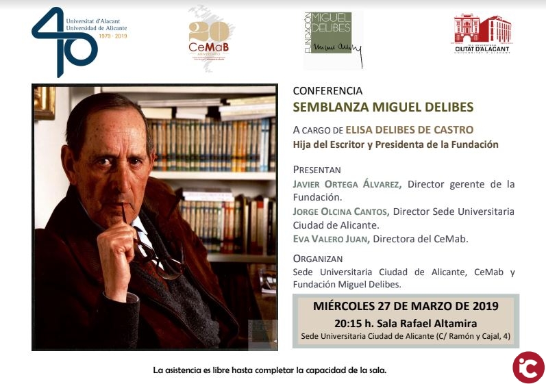 De vesprada, a les 20.15, la Seu Universitària Ciutat d’Alacant (Av. Ramón y Cajal, 4) acollirà la segona activitat, protagonitzada per Elisa Delibes de Castro, filla de l’escriptor i presidenta de la Fundació, qui farà una semblança sobre son pare. Presentaran l’acte Jorge Olcina, director de la Seu, Eva Valero, directora del CeMaB, i Javier Ortega, director gerent de la Fundació.
