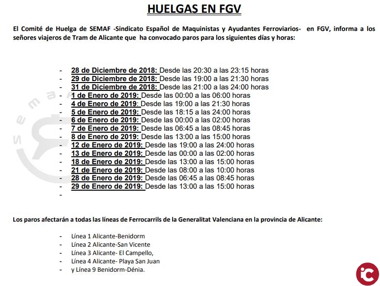 El Comité de Huelga de SEMAF -Sindicato Español de Maquinistas y Ayudantes Ferroviarios- en FGV, informa a los señores viajeros de Tram de Alicante que ha convocado paros para los siguientes días y horas:
