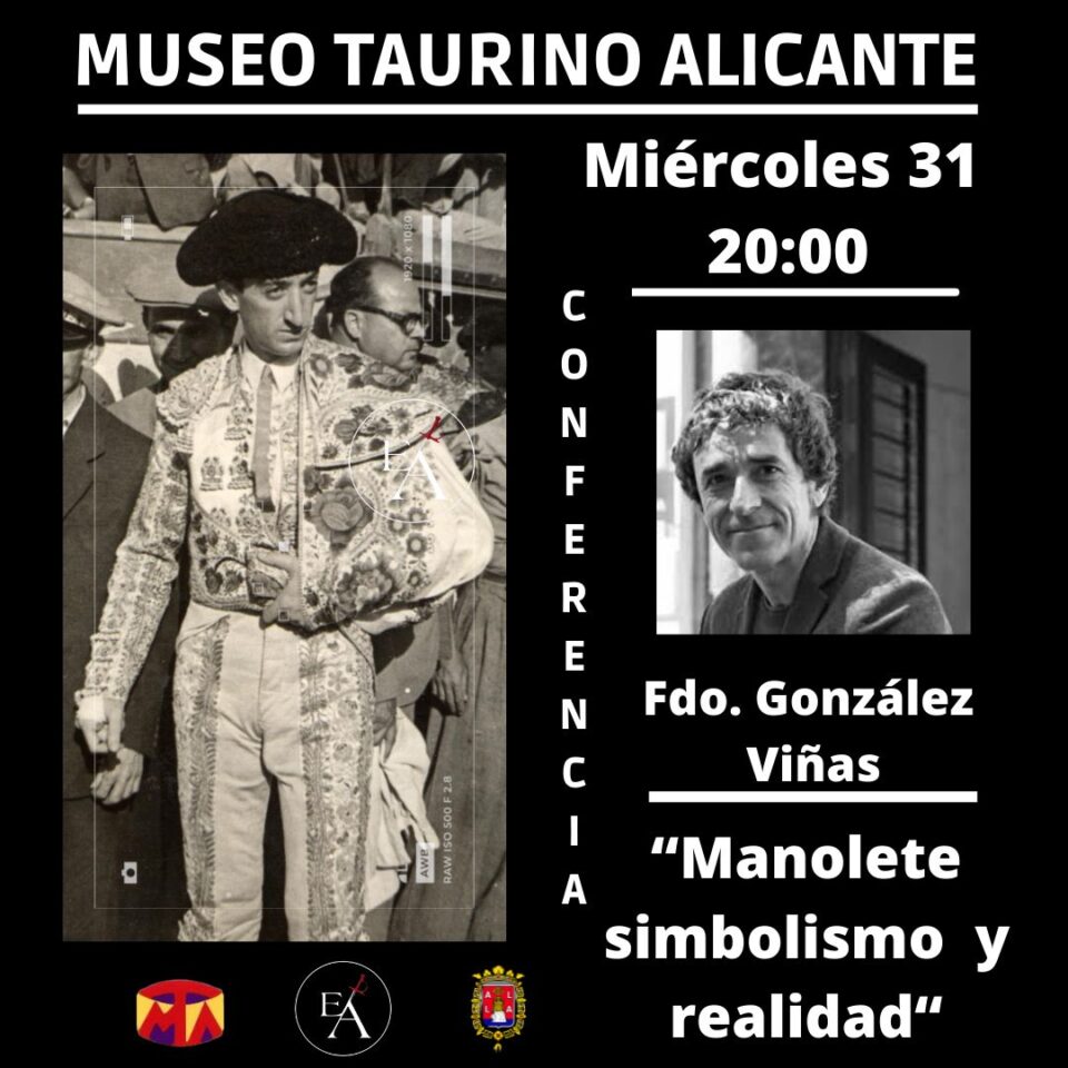 La concejal de la Plaza de Toros, Mari Carmen de España, explica que “una ciudad como Alicante, en la que Manolete fue un referente, está obligada a recordar cómo fue, su trascendencia social y taurina, y sus valiosas aportaciones al toreo”. Fernando González Viñas será el conferenciante de un acto programado el miércoles 31 de agosto, a partir de las 20.30 horas. Hablará sobre “Manolete, simbolismo y realidad”. González Viñas, doctor en Historia y novelista, es autor de cuatro libros sobre el torero cordobés. Son “Manolete, biografía de un sinvivir”, “Los Califas del Toreo: arte y vida”, “Sol y sombras de Manolete” y “Manolete y su época”.