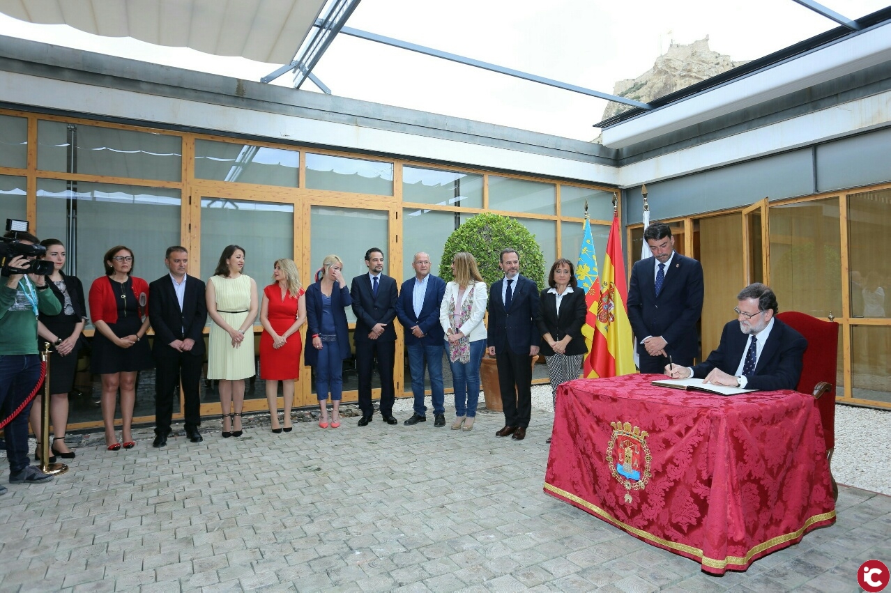 La visita ha continuado en las dependencias de Alcaldía donde el presidente del Gobierno ha firmado en el libro de honor de Alicante, y en este acto además de los miembros de la corporación estuvieron presentes el delegado del Gobierno en la Comunidad Valernciana, Juan Carlos Moragues, el Subdelegado de Gobierno, Jose Miguel Saval, el presidente provincial del PP, José Císcar, el presidente de la Diputación, César Sánchez, así como José Manuel García-Margallo y Eva Ortiz.