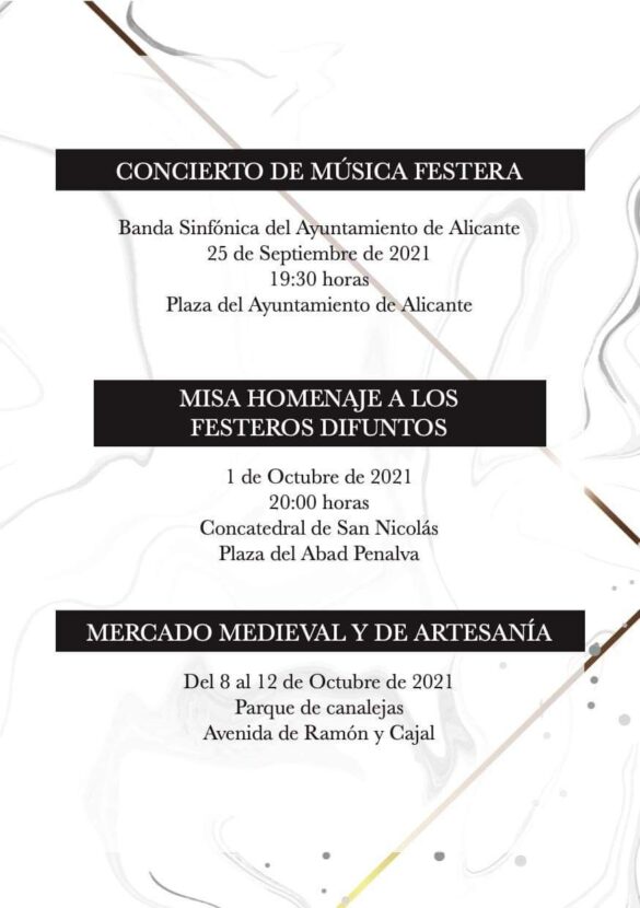 El sábado, 25 de septiembre, de 10:30 a 13:30 h. en el Castillo de Santa Bárbara, se realizará en el I Encuentro de Embajadores Costa Blanca. Más tarde, a las 19:30 h., se ha organizado un Concierto de Música Festera para tal efeméride, donde se estrenará el pasodoble del XXV Aniversario de la Federación de Moros y Cristianos.