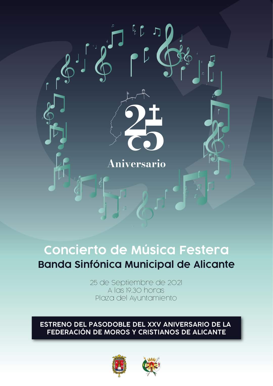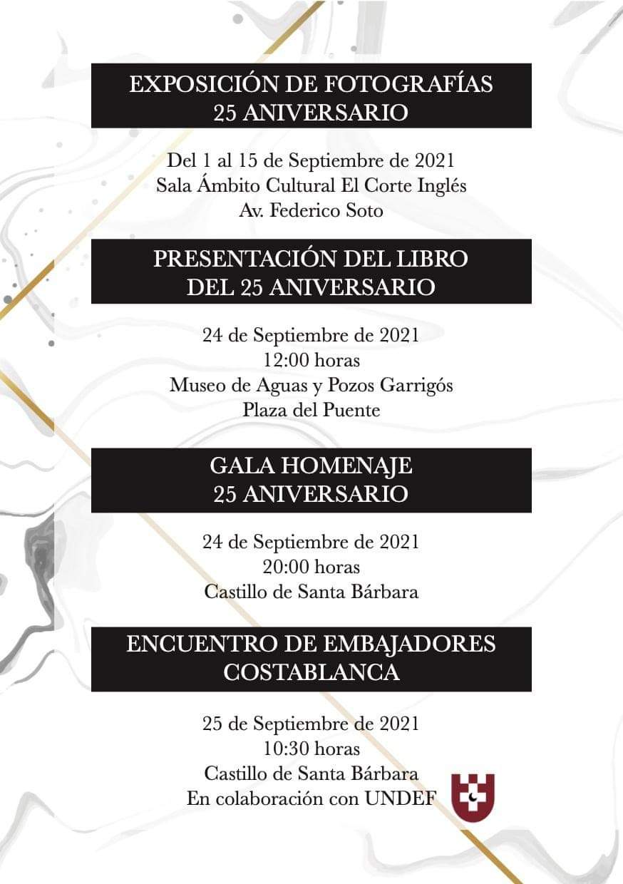 El sábado, 25 de septiembre, de 10:30 a 13:30 h. en el Castillo de Santa Bárbara, se realizará en el I Encuentro de Embajadores Costa Blanca. Más tarde, a las 19:30 h., se ha organizado un Concierto de Música Festera para tal efeméride, donde se estrenará el pasodoble del XXV Aniversario de la Federación de Moros y Cristianos.