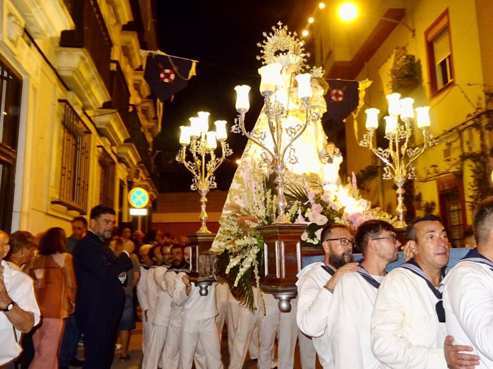 El alcalde, acompañado por la vicealcaldesa Mari Carmen Sánchez, asegura este jueves que “el recuerdo de todos los vecinos que han faltado en estos últimos años se ha hecho presente a lo largo de todo el recorrido. El Alma de Raval, lema de las fiestas de este año, se ha propagado por este rinconcito de Alicante que linda con el Benacantil y el Mediterráneo”. La Virgen del Socorro estrena una saya de terciopelo blanco roto, hecha en Sevilla por Francisco Paredes. También es del mismo autor el manto, de ese mismo color, con unos ángeles en relieve y adornado con motivos marineros como la rosa de los vientos, estrellas, redes y remos. El adorno floral, al igual que el de la Virgen del Lluch, corre a cargo de Juan Carlos Armengol, de “La Tardor”. Lo constituyeron nardos y distintas flores de tonos pastel con toques marineros.