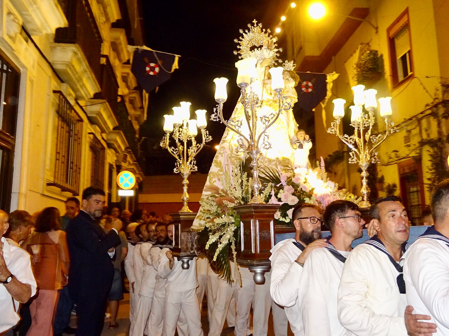 La presidenta de la Cofradía de la Virgen del Remedio, Mari Carmen Lozano, explicó que “los estrenos son una forma de valorar que hemos vuelto a procesionar con nuestras dos imágenes. Han sido momentos muy emotivos los vividos al salir de la ermita”. Las imágenes han partido del templo a los sones de “La Muerte no es Final”, como homenaje a los fallecidos. Ese mismo recuerdo, con brazaletes de luto, lo han llevado los portadores de las dos imágenes. Los más jóvenes, con la Virgen del Lluch; los más veteranos, con la Virgen del Socorro. Entre estos últimos, el presidente de la Mayordomía, Fernando Alonso. Al regreso de la comitiva al interior del templo fueron los marineros quienes interpretaron la “Salve Marinera”, otro de los instantes de mayor intensidad de la anochecida.