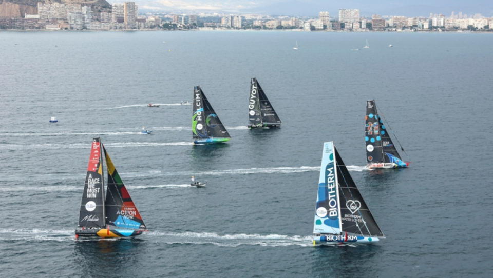 Cinco veleros de la clase IMOCA, barcos voladores de carreras de alta tecnología, zarparon rodeados de un enorme gentío en las aguas situadas junto al Ocean Live Park en el puerto de Alicante justo después de las 16:00 hora local.