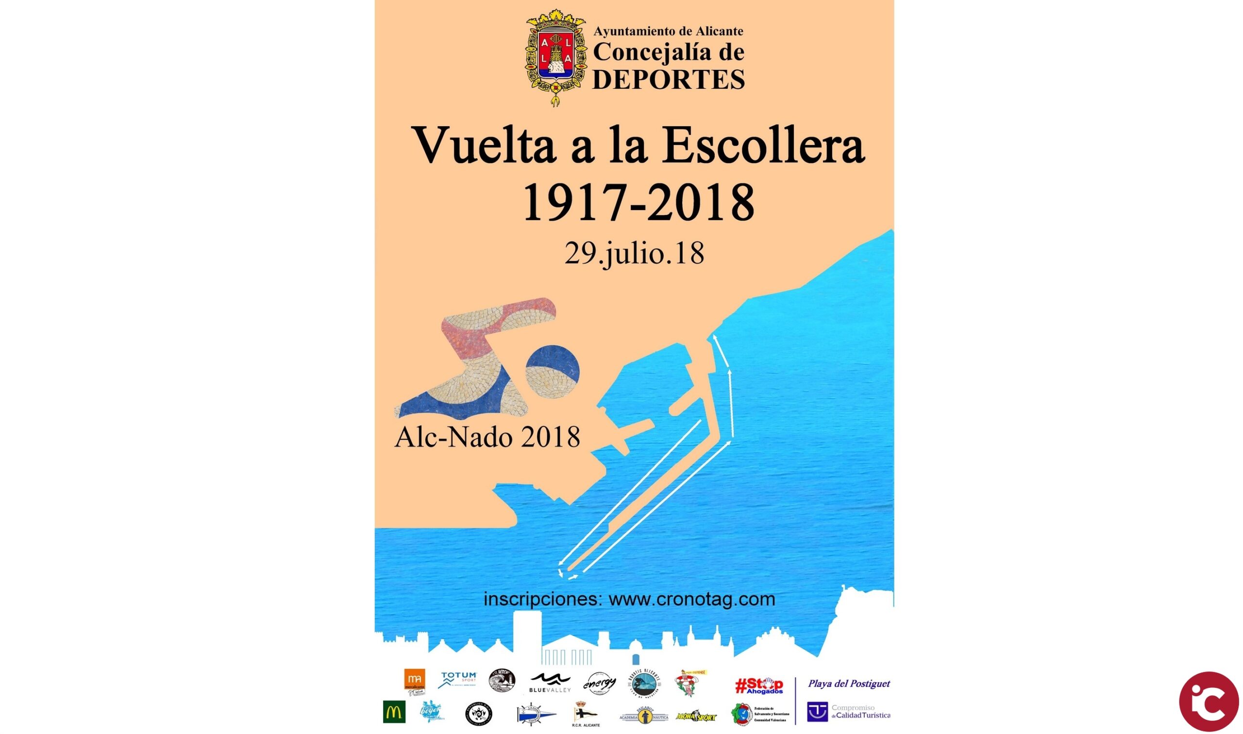 Alicante, 27 de julio de 2018. Este domingo 29 de julio, la concejalía de Deportes del Ayuntamiento de Alicante vuelve a celebrar un año más su popular Vuelta a la Escollera 1917-2018, una de las travesías a nado en activo más antiguas de toda España, y que tiene lugar en la playa del Postiguet.