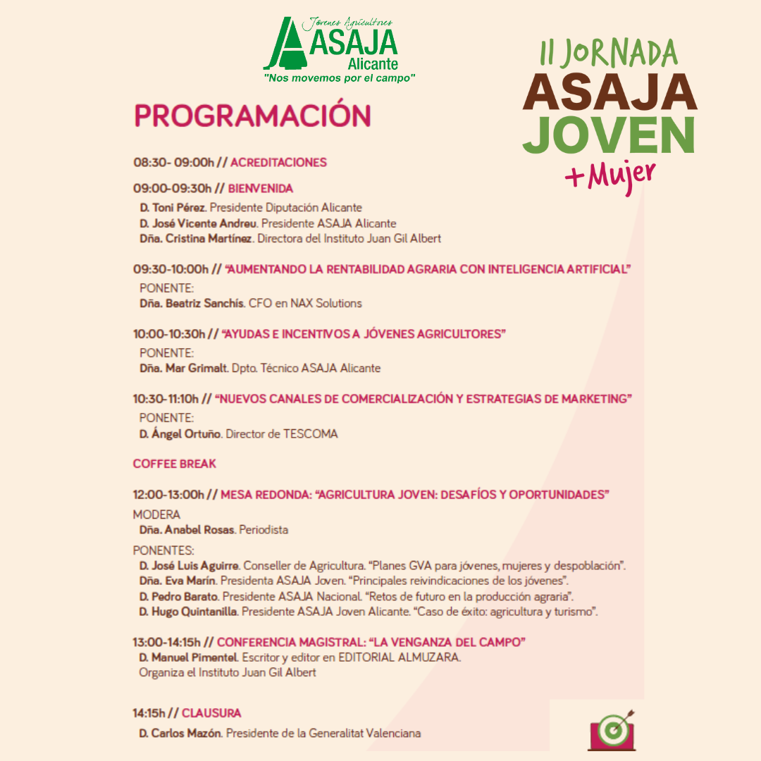 ASAJA Alicante tiene confirmada la asistencia de 300 jóvenes y empresarios vinculados al sector agroalimentario, así como a presidentes de asociaciones, comunidades de regantes y representantes del tejido económico alicantino. Esta iniciativa busca consolidarse como una fuente de motivación e información sobre las posibilidades y ventajas que presenta actualmente la Administración para la incorporación a la agricultura con garantías, así como conclusiones de peso tras el debate que plantearán los expertos buscando mejorar los ingresos de los agricultores, la competitividad y la transición a la digitalización. Cabe destacar la conferencia magistral de D. Manuel Pimentel, ex ministro de Trabajo y Asuntos Sociales y escritor de «La Venganza del Campo».