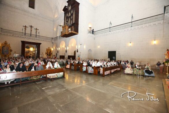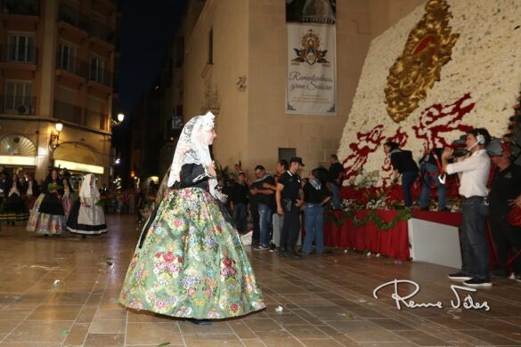 Inés Llavador i les seues dames d’honor han ofrendan a la Virgen del Remedio en la primera sesión de la Ofrenda