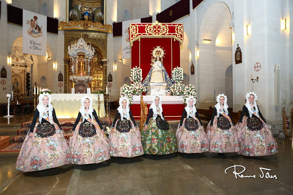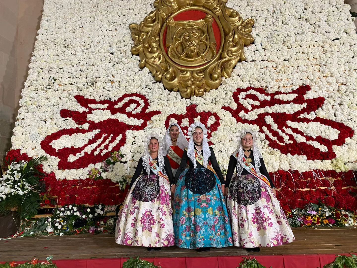 Inés Llavador i les seues dames d’honor han ofrendan a la Virgen del Remedio en la primera sesión de la Ofrenda