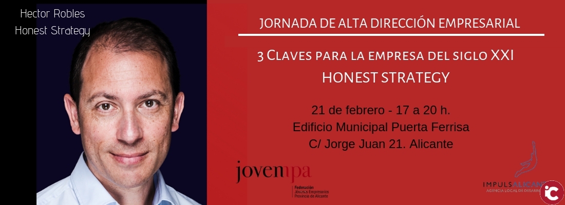 Otro de los eventos del mes es la jornada de Alta Dirección Empresarial “Honest strategy 3 claves para la empresa del siglo XXI”, que se celebrará el 21 de febrero de 17 a 19 horas en Puerta Ferrisa en colaboración con JOVEMPA y será impartida por Hector Robles, creador del movimiento “Honest strategy”.