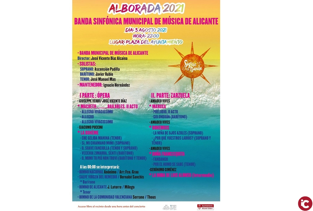 La Alborada a la Virgen del Remedio, programada para el martes 3 de agosto (22.15 horas) en la Plaza del Ayuntamiento, combinará fragmentos de ópera y zarzuela en el concierto que ofrecerá la Banda Sinfónica Municipal, dirigida por José Vicente Díaz Alcaina. El recinto abrirá una hora antes del concierto y para acceder se aplicarán las medidas anti-covid-19, como la toma de temperatura o el uso de gel hidroalcohólico.