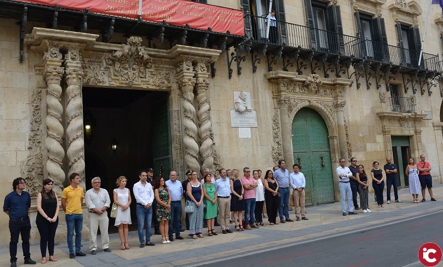 Alicante, 28 de agosto de 2018. La alcaldesa en funciones, Mari Ángeles Goitia, ha presidido este mediodía en la plaza del Ayuntamiento el minuto de silencio por la última víctima de violencia machista. El suceso en el que fue asesinada, presuntamente, una mujer de 60 años a manos de su pareja, ocurrió en el término municipal de Orihuela.