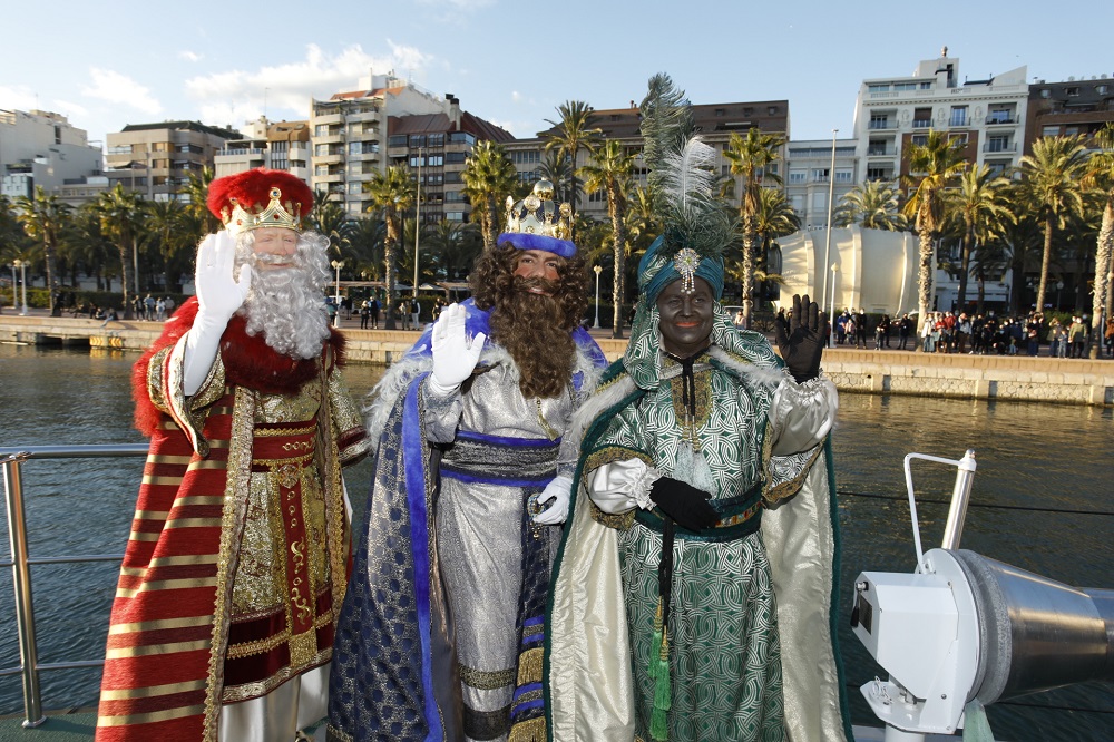 Melchor, Gaspar y Baltasar han llegado en barco a Alicante. En uno de los atraques del puerto han sido recibidos por el alcalde Luis Barcala, la vicealcaldesa Mari Carmen Sánchez, y el edil de Fiestas. A continuación, se han dirigido a la plaza de toros donde se representaba el espectáculo “La Estación de los Cuentos” a la espera de Sus Majestades. A su llegada han recorrido el ruedo saludando a los asistentes antes de pronunciar unas palabras dirigidas a la chavalería, en presencia de Barcala, Sánchez y Jiménez.