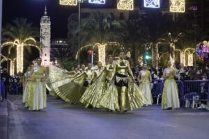 La carroza del Rey Melchor ha estado precedida por un ballet. Su boato lo han conformado integrantes de la Federación de Moros y Cristianos de Alicante (FMYCA). La banda de música de Ciudad de Asís se ha situado detrás de la carroza. También ha sido la FMYCA quien ha arropado la carroza de Gaspar, que ha contado con los músicos de L´Harmonia, y a la de Baltasar. Ésta, como cierre de esa parte del desfile, la ha escoltado la Banda Sinfónica Municipal.