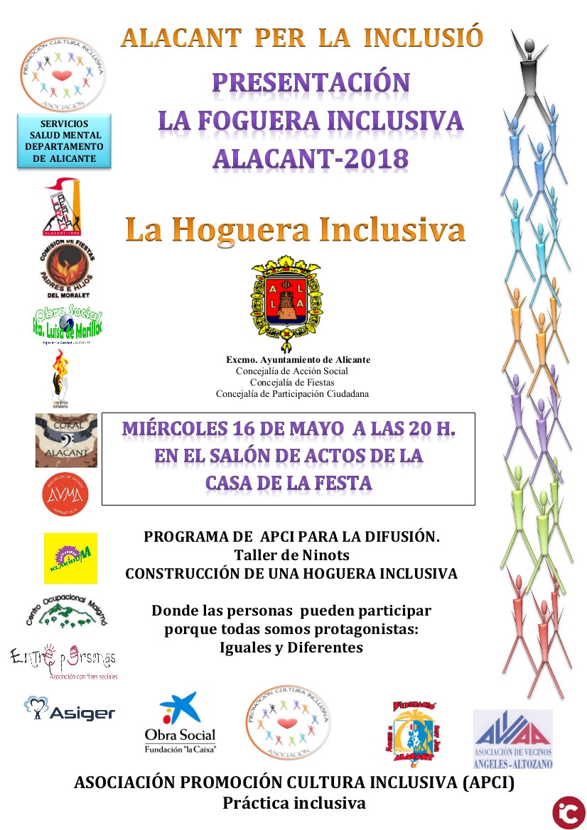 La Asociación Promoción Cultura Inclusiva (APCI) ha llevado a cabo la construcción de esta hoguera formada por más de 160 ninots y ninets con el objetivo de crear contextos en los que cualquier persona pueda participar, independientemente de su diagnóstico o perfil psicológico, conformando así una propuesta de actividades de lucha contra el estigma de personas que tienen discapacidad intelectual y/o dolencia mental.