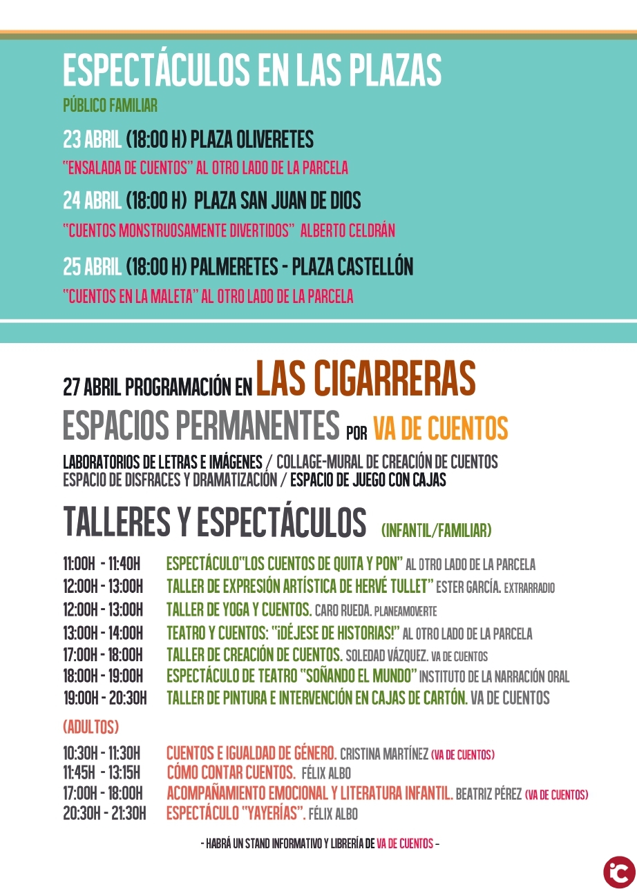 Durante la jornada del 27 de abril, en el Centro Cultural Las Cigarreras, habrán espacios permanentes, desde las 10 horas, organizados por Va de Cuentos, en los que tendrán lugar desde “Laboratorios de letras e imágenes”, a la realización de un mural colectivo con collages de cuentos, y espacios destinados a la creatividad, con disfraces, dramatización y juegos con cajas y materiales reciclados.