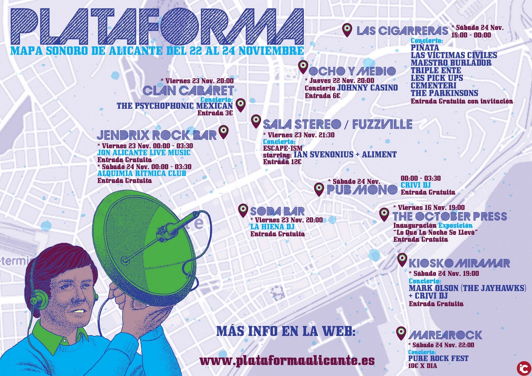 La programación completa, que puede consultarse en la web del Ayuntamiento www.alicante.es, forma un mapa sonoro que sirve como ejemplo de la ferviente actividad cultural de la ciudad de Alicante en la actualidad. Una guía de conciertos formada por una oferta variada de artistas, salas y espacios locales que componen la actual escena musical de la ciudad.