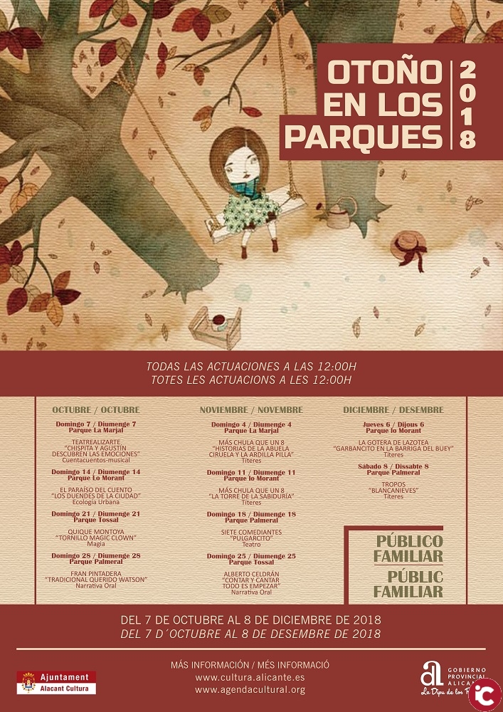 Alicante 2 de octubre de 2018. La edil de Cultura, Mª Dolores Padilla, presenta una programación familiar en los Parques Municipales para los meses de octubre a diciembre. Un total de 10 representaciones, con entrada libre y programadas a las 12 horas, que comenzarán este domingo 7 de octubre en el Parque La Marjal, con un cuenta cuentos musical a cargo de Teatralizarte.