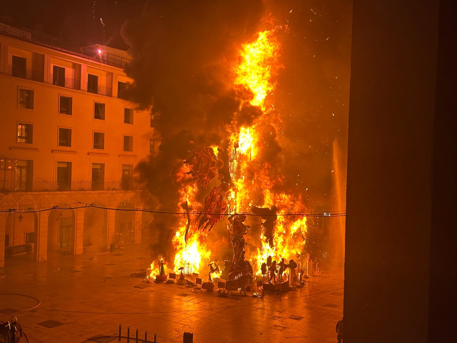 La cremà de Identidad fue cuidadosamente diseñada por la pirotecnia Hermanos Sirvent, iniciándose desde el corazón del remate hacia las bases, lo que permitió una combustión controlada y estéticamente impactante. El alcalde Luis Barcala destacó que «la cremà de la hoguera oficial ha sido impecable, ha ardido como un pebetero», resaltando además que, por primera vez en años, las Belleas pudieron contemplar la magnífica Palmera desde la Plaza del Ayuntamiento