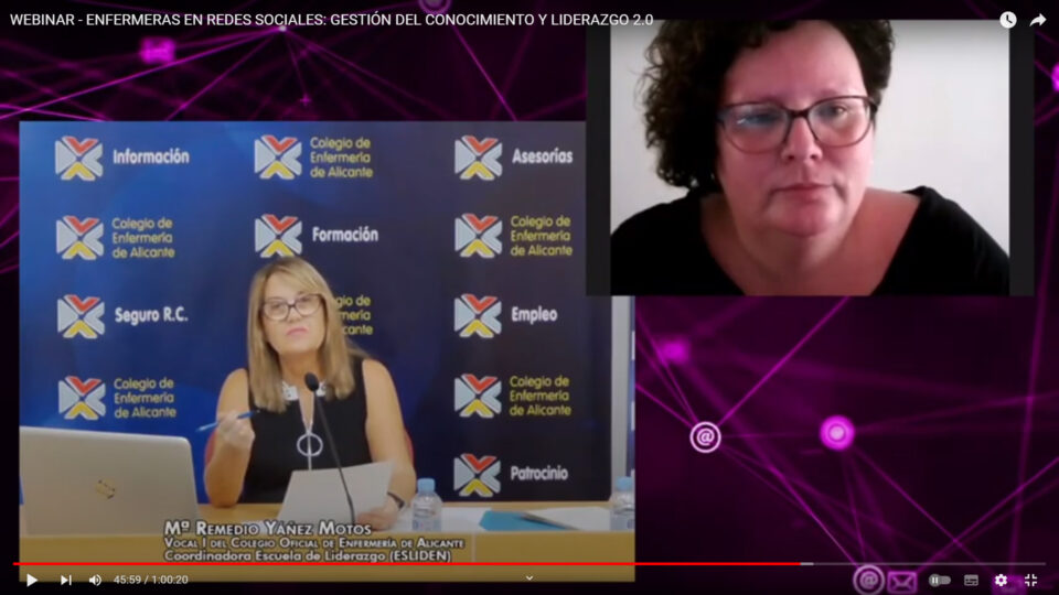 (2022-9-29) El Colegio de Enfermería de Alicante ha celebrado el webinar “Enfermeras/os en redes sociales: gestión del conocimiento y liderazgo 2.0”, en el que se contó como ponente con Rosario Ros Navarret, enfermera, supervisora del Área de Gestión Clínica del Niño Hospital La Fe de Valencia y Máster en Salud Digital. Una actividad organizada por la Escuela de Liderazgo (ESLIDEN) del Colegio de Enfermería de Alicante, cuya coordinadora es la vocal I de la Junta de Gobierno, Mª Remedio Yáñez Motos, que fue la encargada de moderar el webinar, que puede verse en este enlace.