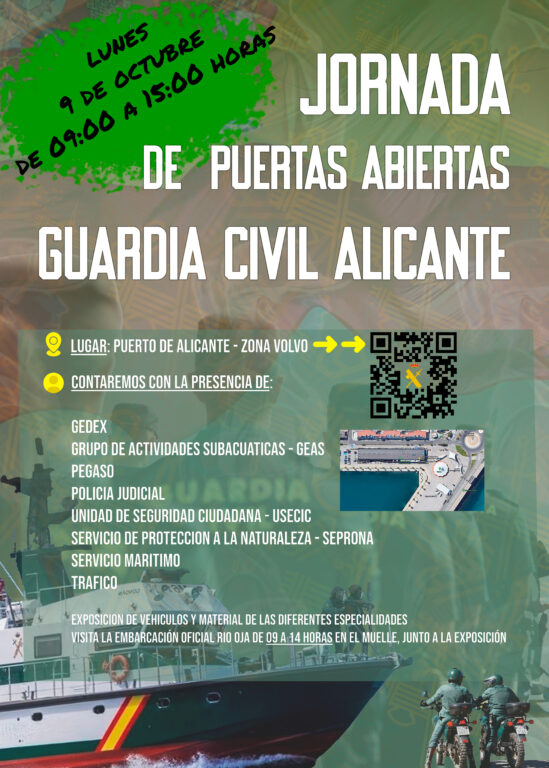 Durante esta jornada, los asistentes tendrán la oportunidad de explorar una impresionante exhibición de material, equipos, vehículos y otros objetos de especialidades de la Guardia Civil. Entre las unidades presentes se encuentran el Grupo de Actividades Subacuáticas (GEAS), el Grupo Especial de Desactivación de Explosivos (GEDEX), la Unidad de Seguridad Ciudadana (USECIC), la Unidad Orgánica de Policía Judicial (UOPJ), el Servicio de Protección de la Naturaleza (SEPRONA), el equipo ‘Pegaso’ y la Agrupación de Tráfico. Además, entre las 09:00 y las 14:00 horas, los visitantes podrán subir a bordo de una de las embarcaciones del Servicio Marítimo de Alicante.