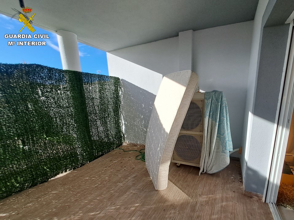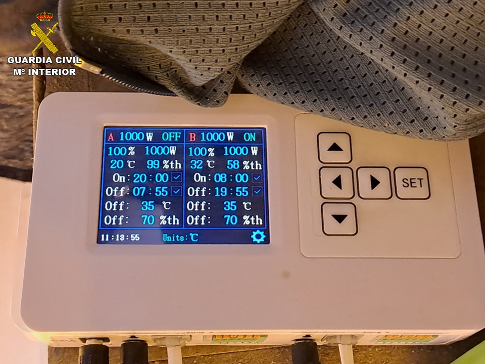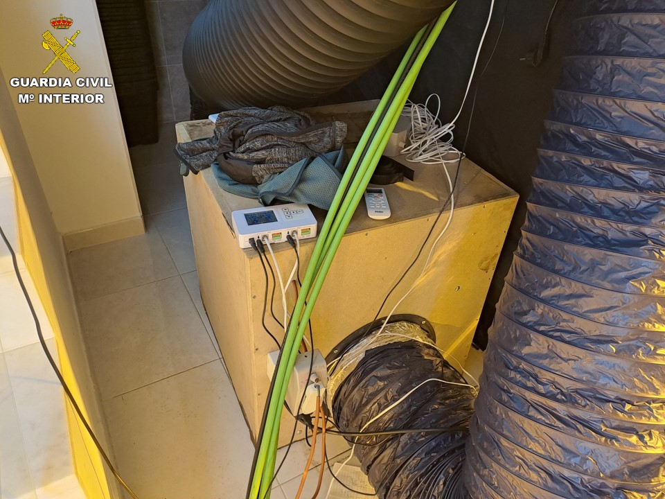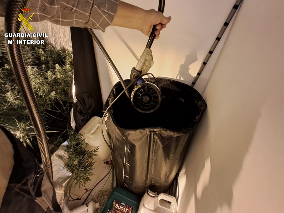 En el registro realizado en Aguas de Busot, se localizaron dos sofisticadas plantaciones de marihuana de alto rendimiento tipo indoor. La instalación era compleja, por un lado los habitáculos de la vivienda estaban perfectamente aislados para evitar fugas de calor y olores que pudiesen levantar sospechas, mientras por otro lado un moderno sistema domótico a través de wifi controlaba la temperatura y la intensidad de la luz. Además, los agentes descubrieron un novedoso sistema que aportaba a las plantas anhídrido carbónico en estado gaseoso, con la finalidad de acelerar el rendimiento de la cosecha. Los investigadores localizaron un sistema de cableado que permitía obtener de manera fraudulenta la electricidad necesaria para mantener toda la logística necesaria para la plantación, mediante un puenteado a la red pública, siendo el perjuicio económico ocasionado en alrededor de 37.000 euros.