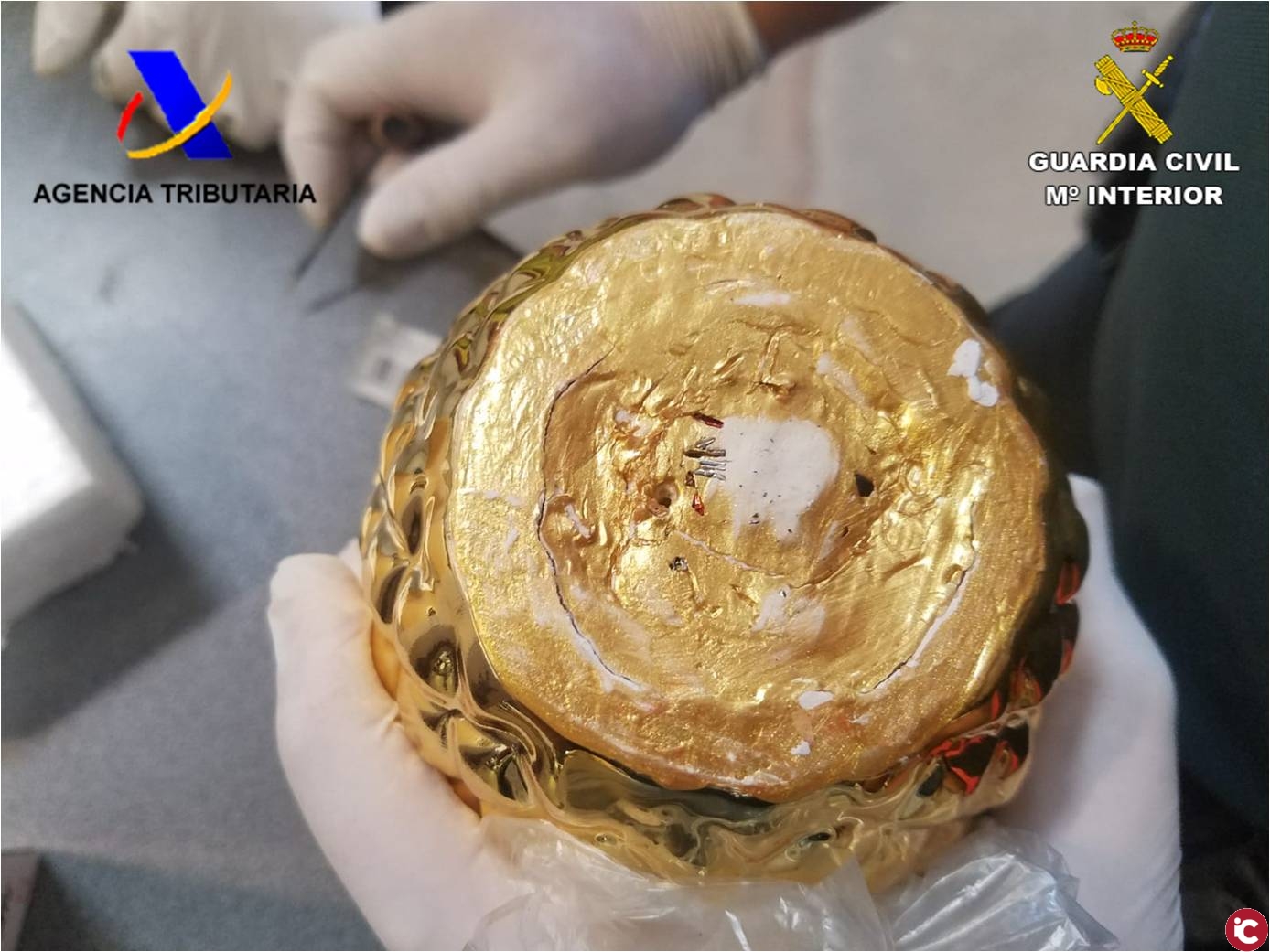 Durante una inspección realizada en un almacén de paquetería del aeropuerto de Alicante-Elche, una caja de pequeñas dimensiones que tenía como destino final un país del norte de Europa, levantó las sospechas de los agentes del Servicio Fiscal de la Guardia Civil. Una vez que procedieron a abrir la caja, se encontraron con dos simples figuras de escayola en forma de piña de color dorado.