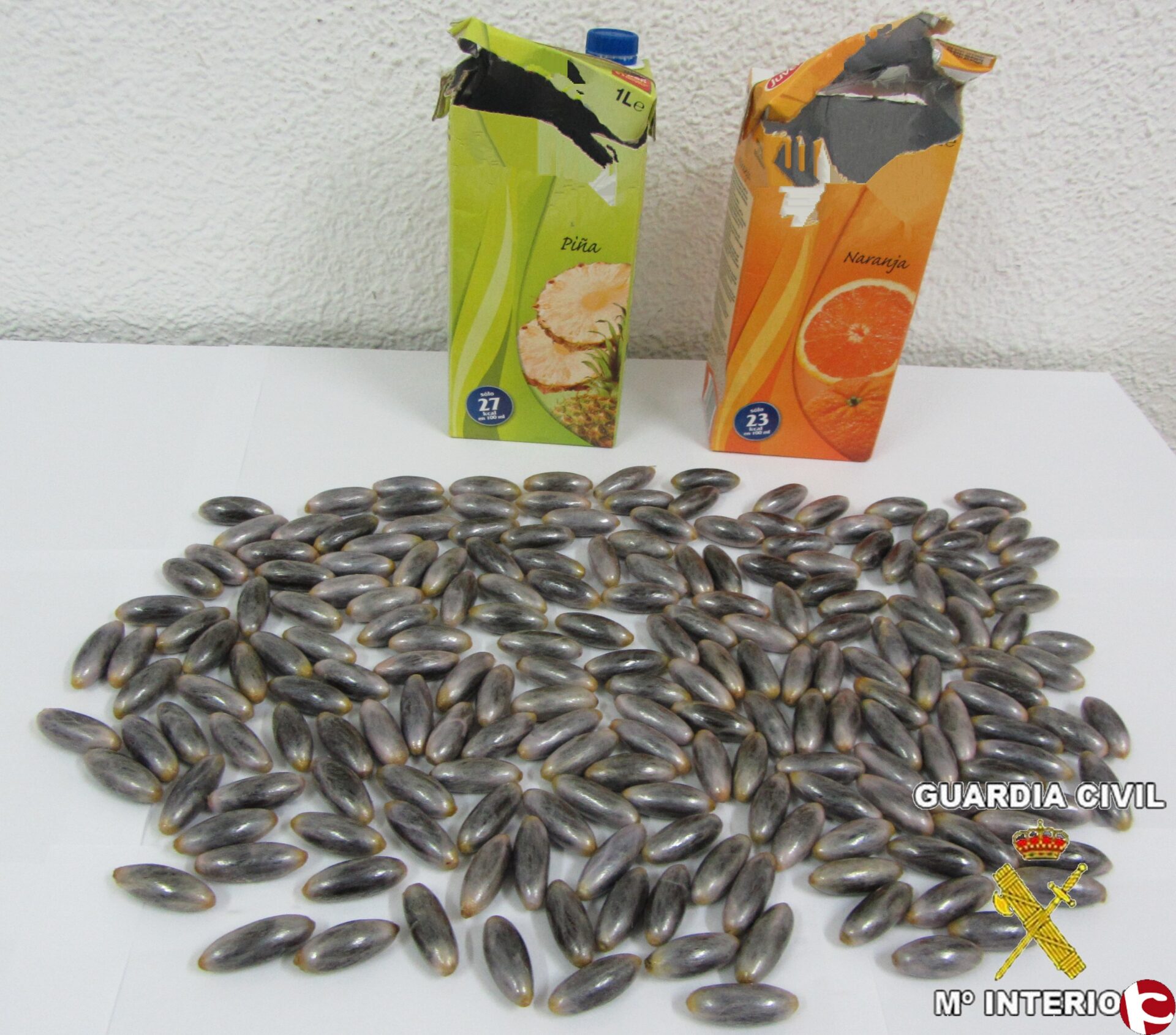 Durante el mismo día, agentes de la Benemérita que prestaban servicio de Resguardo Fiscal en el Muelle La Pansa de la localidad de Denia, identificaron a un individuo que se disponía a embarcar en un ferry de línea regular con destino al Puerto de San Antonio (Ibiza), localizando en el interior de su furgoneta, 197 bellotas de hachís ocultas en dos briks de zumo, con un peso total de 1 kilogramo.
