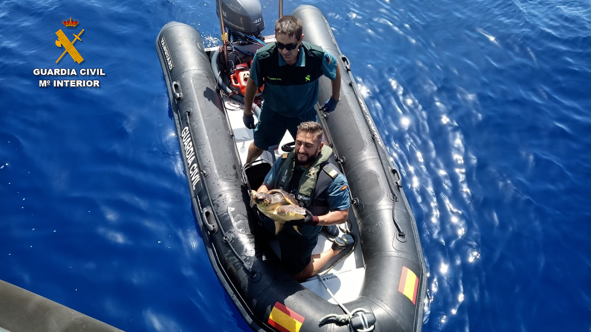 La Guardia Civil rescata en aguas de Alicante una tortuga boba atrapada en una baliza de arte de pesca ilegal