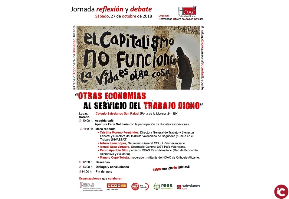 Será en el colegio Salesianos San Rafael (Porta de la Morera, 24) siendo un acto abierto al que se invita a participar a todas aquellas personas, creyentes o no, interesadas en fomentar otras economías al servicio de un trabajo digno. La parte central de esta jornada de reflexión y debate será la mesa redonda que comenzará a las 11:00 horas y en la que se contará con las intervenciones de la directora general de Trabajo y Bienestar Laboral y directora del Instituto Valenciano de Seguridad y Salud en el Trabajo (INVASSAT), Cristina Moreno Fernández, el secretario general de CCOO de la Comunidad Valenciana, Arturo León López, el secretario general de UGT de la Comunidad Valenciana, Ismael Sáez Vaquero y el portavoz de la Red de Economía Alternativa y Solidaria (REAS) de la Comunidad Valenciana, Pedro Aparicio Sáiz. Como moderador estará Manolo Copé, militante de HOAC de Orihuela-Alicante.