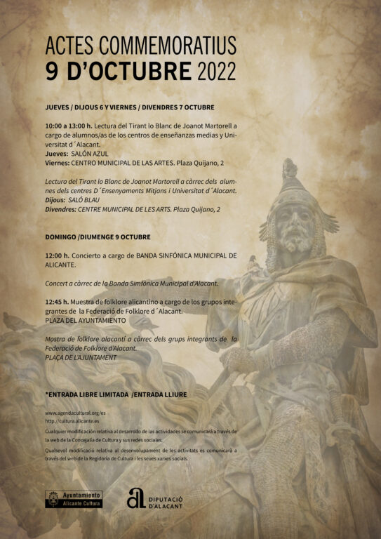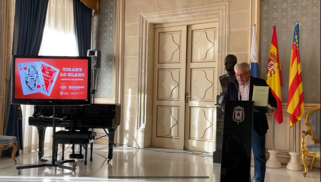 Este miércoles en el Salón Azul del Ayuntamiento, como inicio del programa de actos, ha tenido lugar la lectura del primer fragmento en valenciano de la novela ‘Tirant lo Blanc’ de Joanot Martorell. Y mañana, en el Centro Municipal de las Artes, un total de 350 alumnos de secundaria del IES Jorge Juan, Jaime II, Antonio José Cavanilles, Miguel Hernández, Figueres Pacheco, el IES María Blasco de San Vicente y también la Universidad de Alicante leerán la última parte del libro.