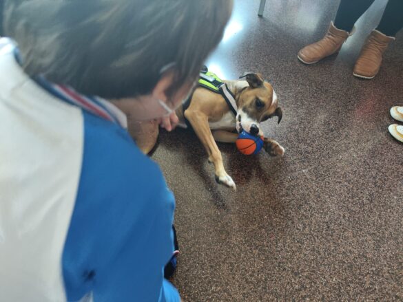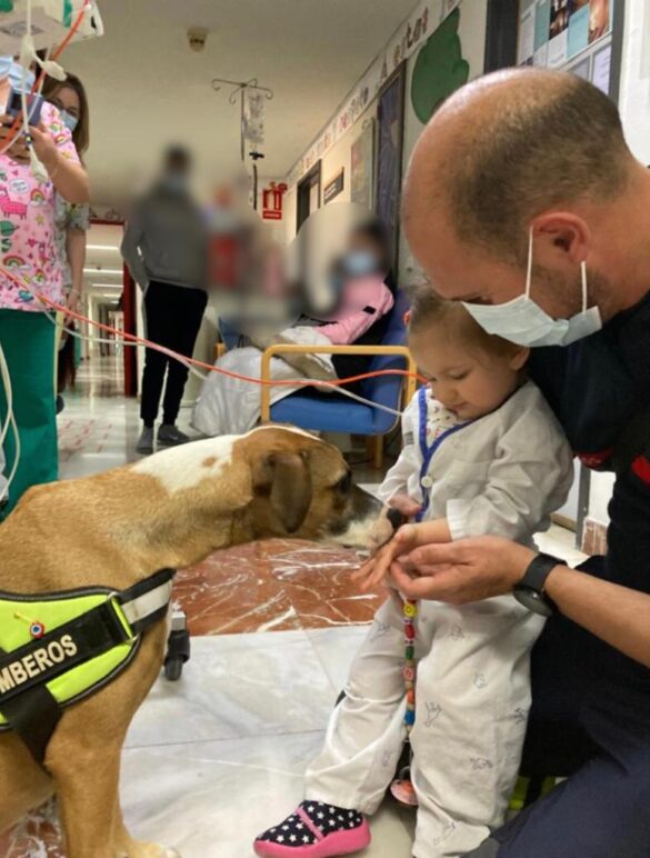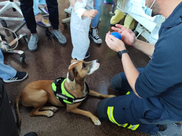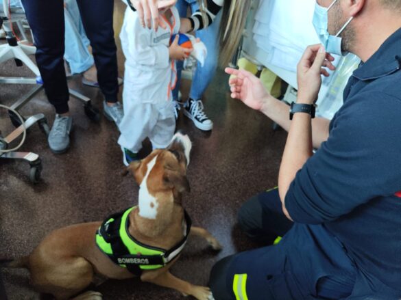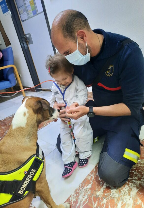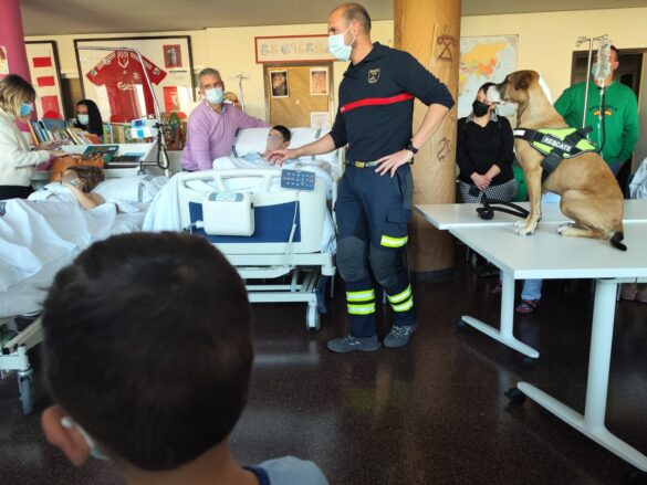 Durante la visita ‘Piña’ y Ángel hicieron una demostración de las labores que llevan a cabo desde el SPEIS y cómo trabaja un guía canino con sus perros, especializado en la búsqueda y localización de personas. Para ello, algunos de los menores se escondieron entre los despachos, y ‘Piña’ les localizó de inmediato ante la atenta mirada de familiares, personal sanitario y el resto de niños ingresados y mientras Ángel les explicaba con detalle este tipo de adiestramiento.