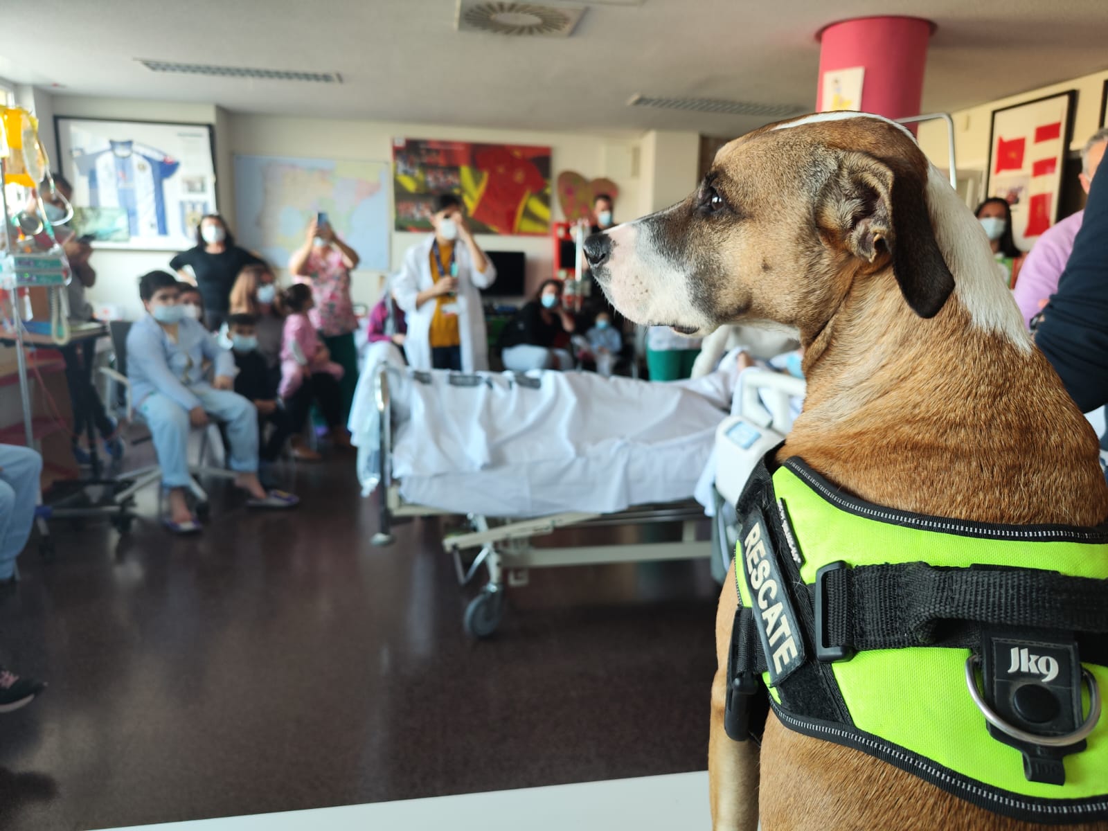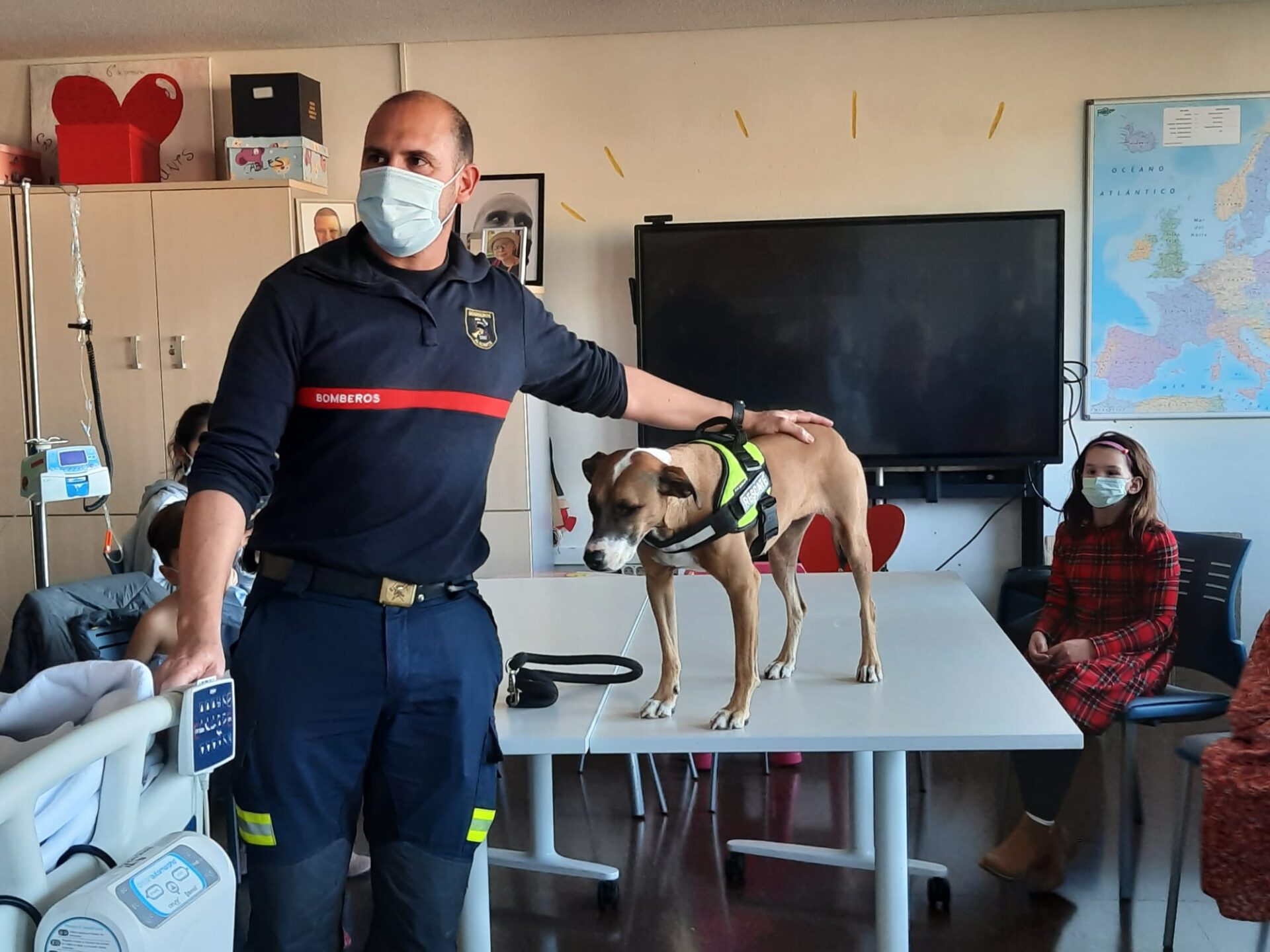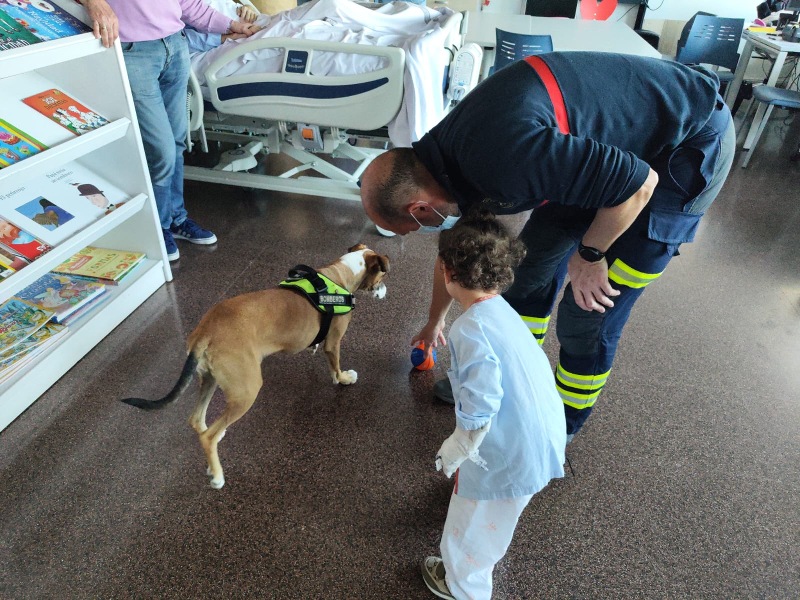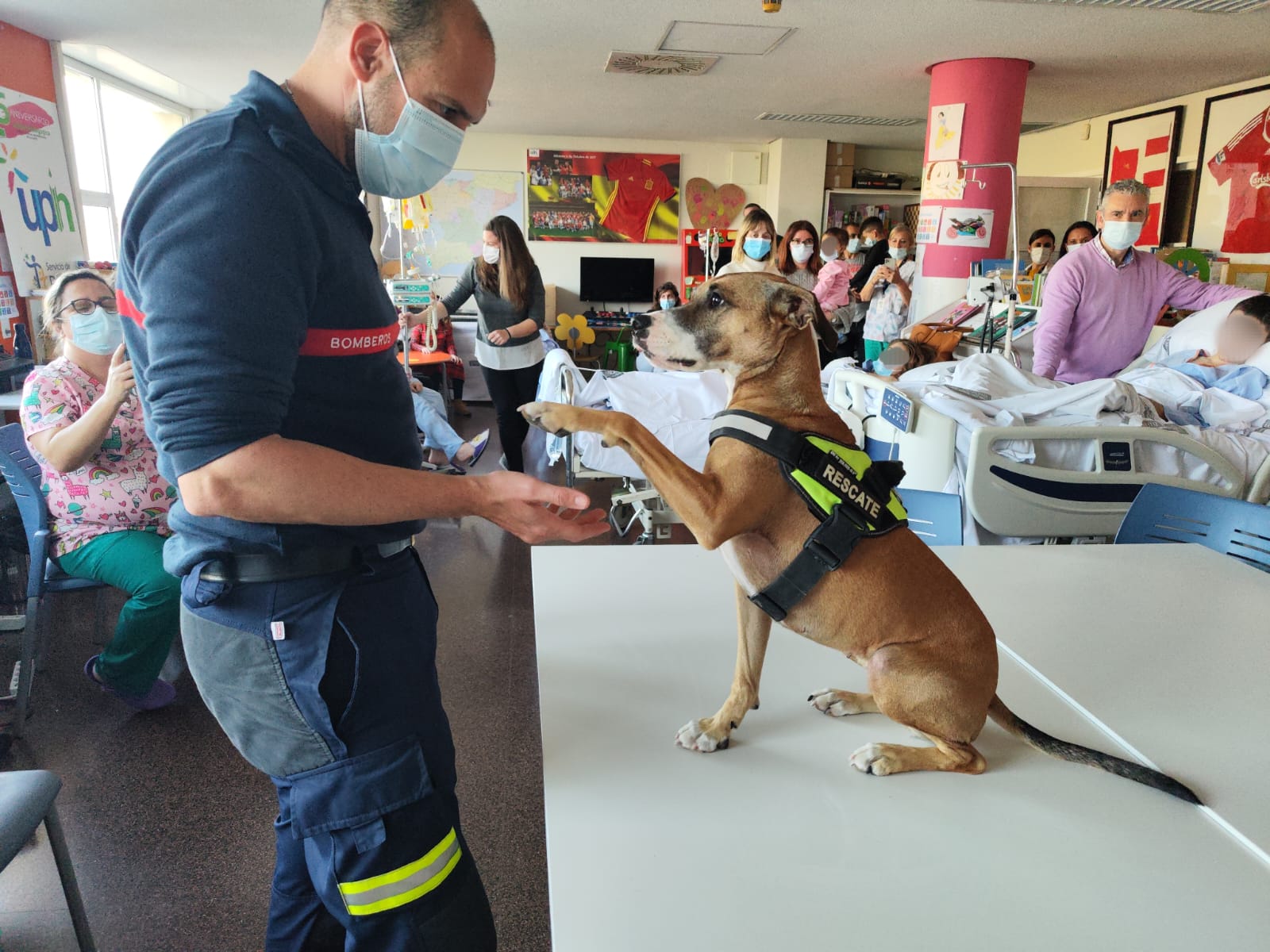 Durante la visita ‘Piña’ y Ángel hicieron una demostración de las labores que llevan a cabo desde el SPEIS y cómo trabaja un guía canino con sus perros, especializado en la búsqueda y localización de personas. Para ello, algunos de los menores se escondieron entre los despachos, y ‘Piña’ les localizó de inmediato ante la atenta mirada de familiares, personal sanitario y el resto de niños ingresados y mientras Ángel les explicaba con detalle este tipo de adiestramiento.