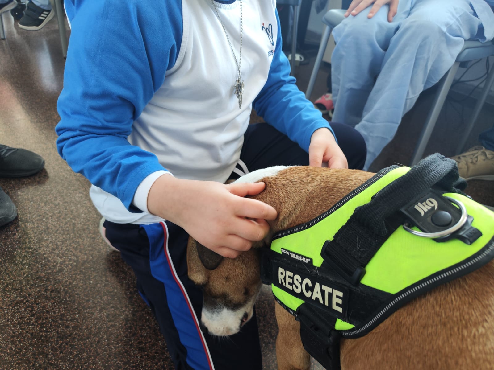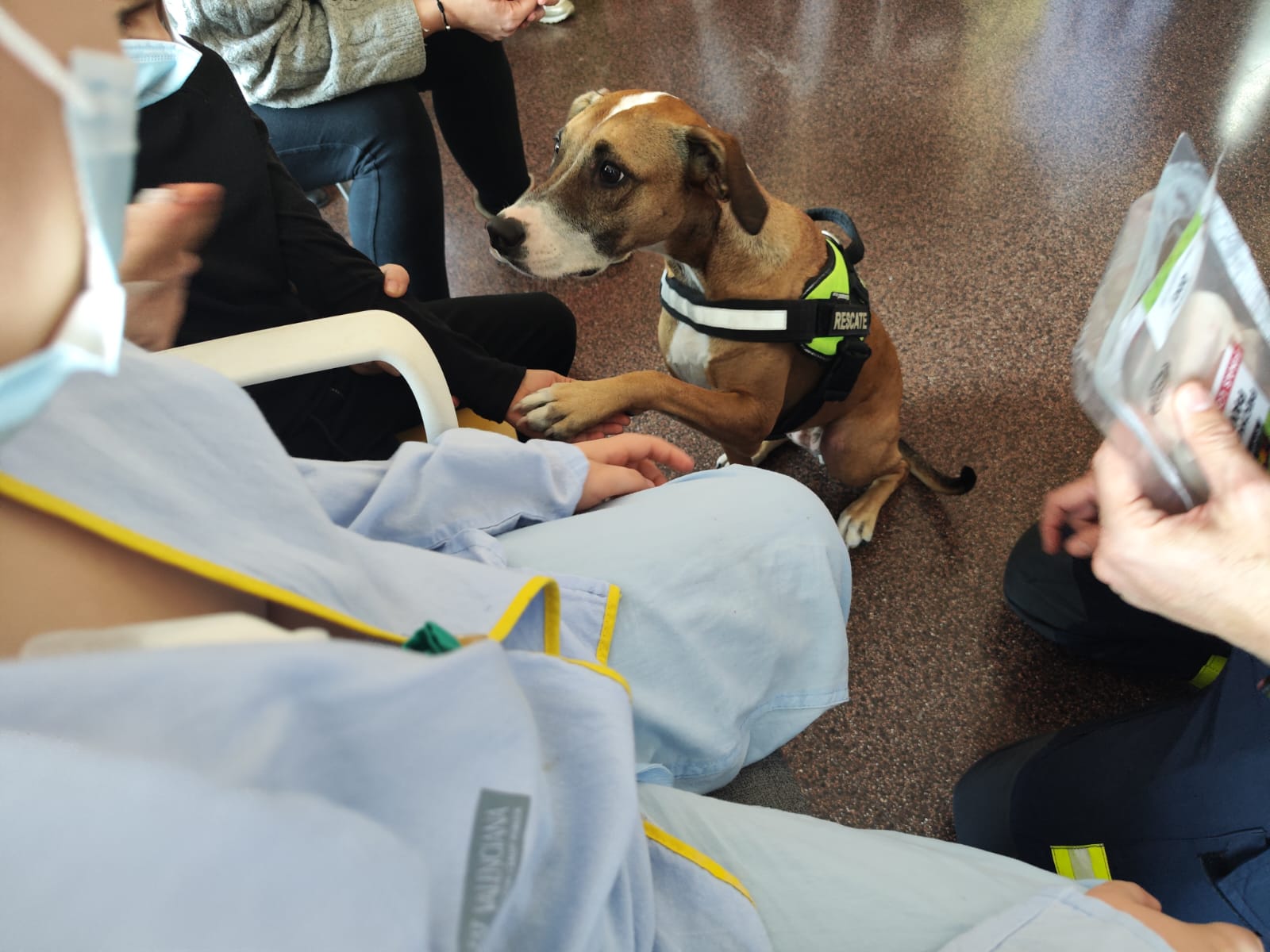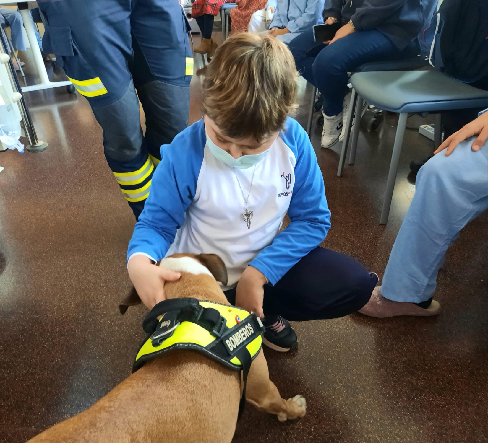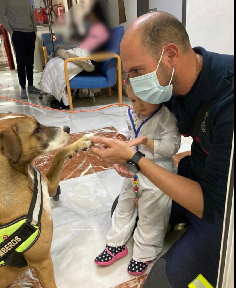 Durante la visita ‘Piña’ y Ángel hicieron una demostración de las labores que llevan a cabo desde el SPEIS y cómo trabaja un guía canino con sus perros, especializado en la búsqueda y localización de personas. Para ello, algunos de los menores se escondieron entre los despachos, y ‘Piña’ les localizó de inmediato ante la atenta mirada de familiares, personal sanitario y el resto de niños ingresados y mientras Ángel les explicaba con detalle este tipo de adiestramiento.