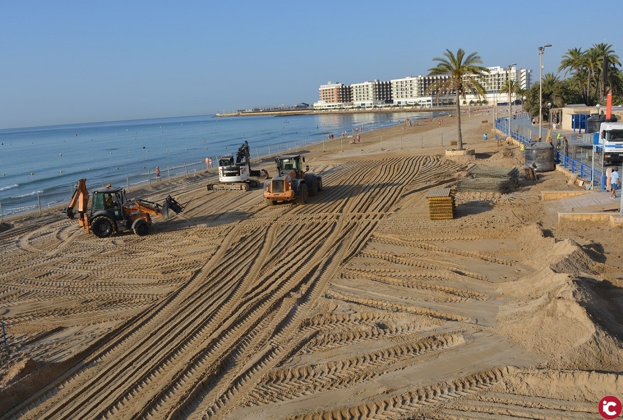 La playa del Postiguet recobra la normalidad este fin de semana tras la retirada de materiales de obra, alisado de arena y montaje de lavapiés y pasarelas
