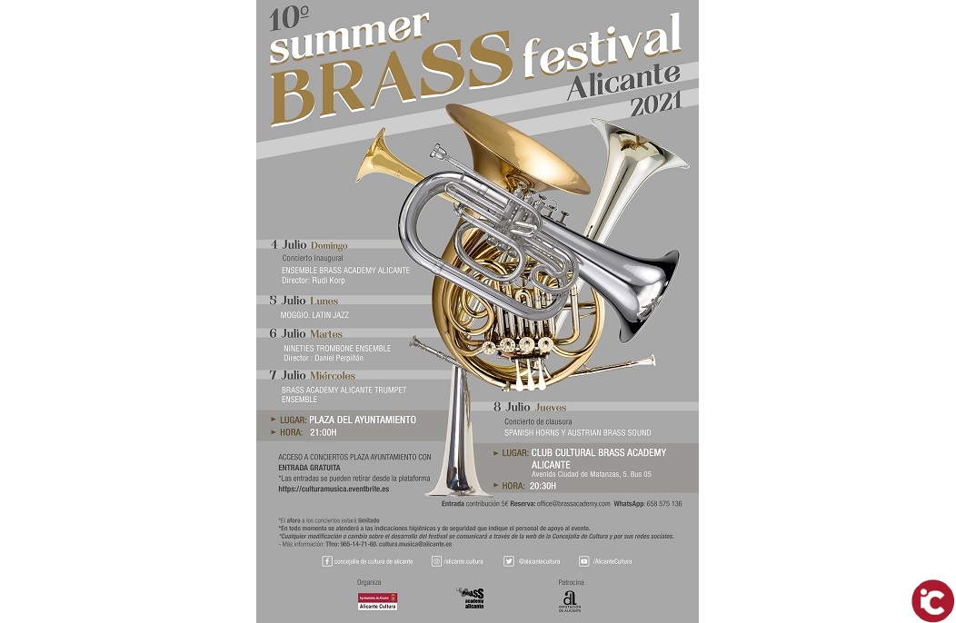 La Concejalía de Cultura, Diputación y la Brass Academy colaboran en la puesta a punto de la décima edición de este ciclo de verano, con el que la academia pone el broche de oro a su curso de música internacional, al que acuden a Alicante alumnos de toda España y de varios países, entre ellos Italia, Colombia, Irlanda, Portugal o México.