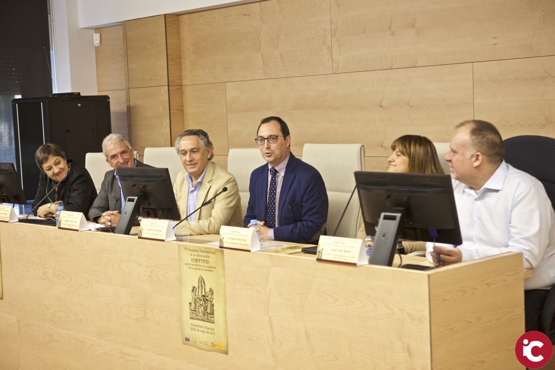 “En aquests temps en què per a les Humanitats no hi ha diners, s’agraeix la labor feta per estudiosos com Josep Lluís Martos”, ha assenyalat Cleofé Tato, presidenta de l’Associació Internacional Convivio, per a referir-se al president i organitzador del VI Congrés Internacional Convivio per a l’Estudi de la Poesia de Cançoner a la Universitat d’Alacant, durant l’acte d’inauguració d’aquest. Al seu costat, presidia la taula inaugural Juan Mora, director del Secretariat d’Investigació de la UA, qui ha disculpat l’absència d’Amparo Navarro, vicerectora d’Investigació i Transferència de Coneixement. Compartien el moment Juan Mesa, degà de la Facultat de Filosofia i Lletres; Antoni Mas, director de la Seu d’Alacant de l’Institut Interuniversitari de Filologia Valenciana; M. Àngels Francés, directora del Departament de Filologia Catalana; i Josep Lluís Martos, president del Comitè organitzador del VI Congrés Internacional Convivio per a l’Estudi de la Poesia de Cançoner.