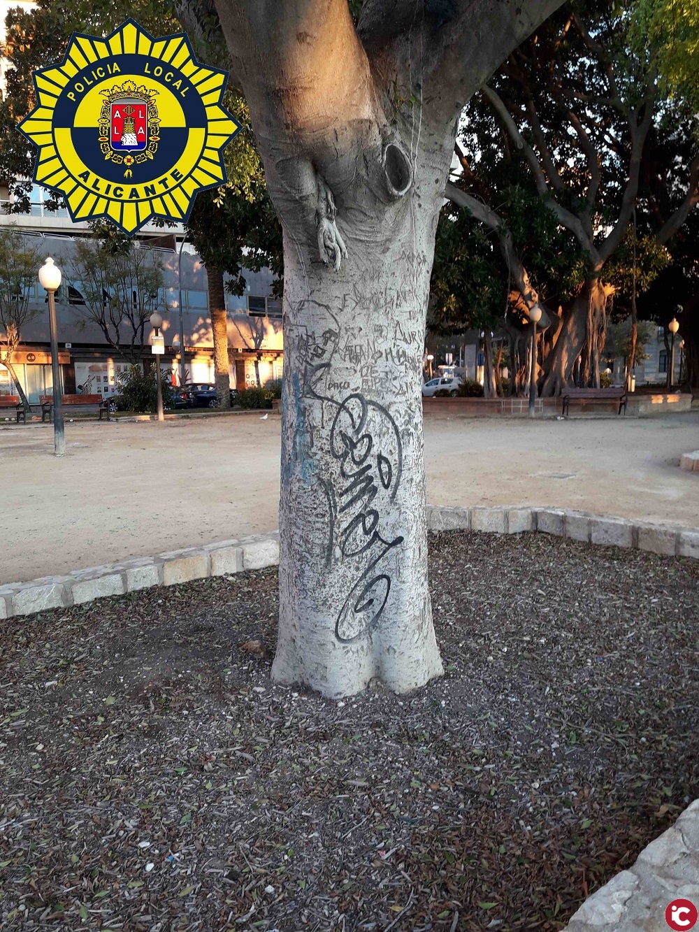 La Concejalía de Seguridad Ciudadana del Ayuntamiento de Alicante informa que agentes de la Policía Local de la Unidad de Imagen Urbana han localizado, después de una investigación de varios meses, a un varón de 24 años de edad de Alicante, al que se le imputa la responsabilidad civil como presunto autor del grafiti pintado en un ficus nítida, árbol centenario del Parque de Canalejas en el que dejó su impronta varias veces en el tronco.