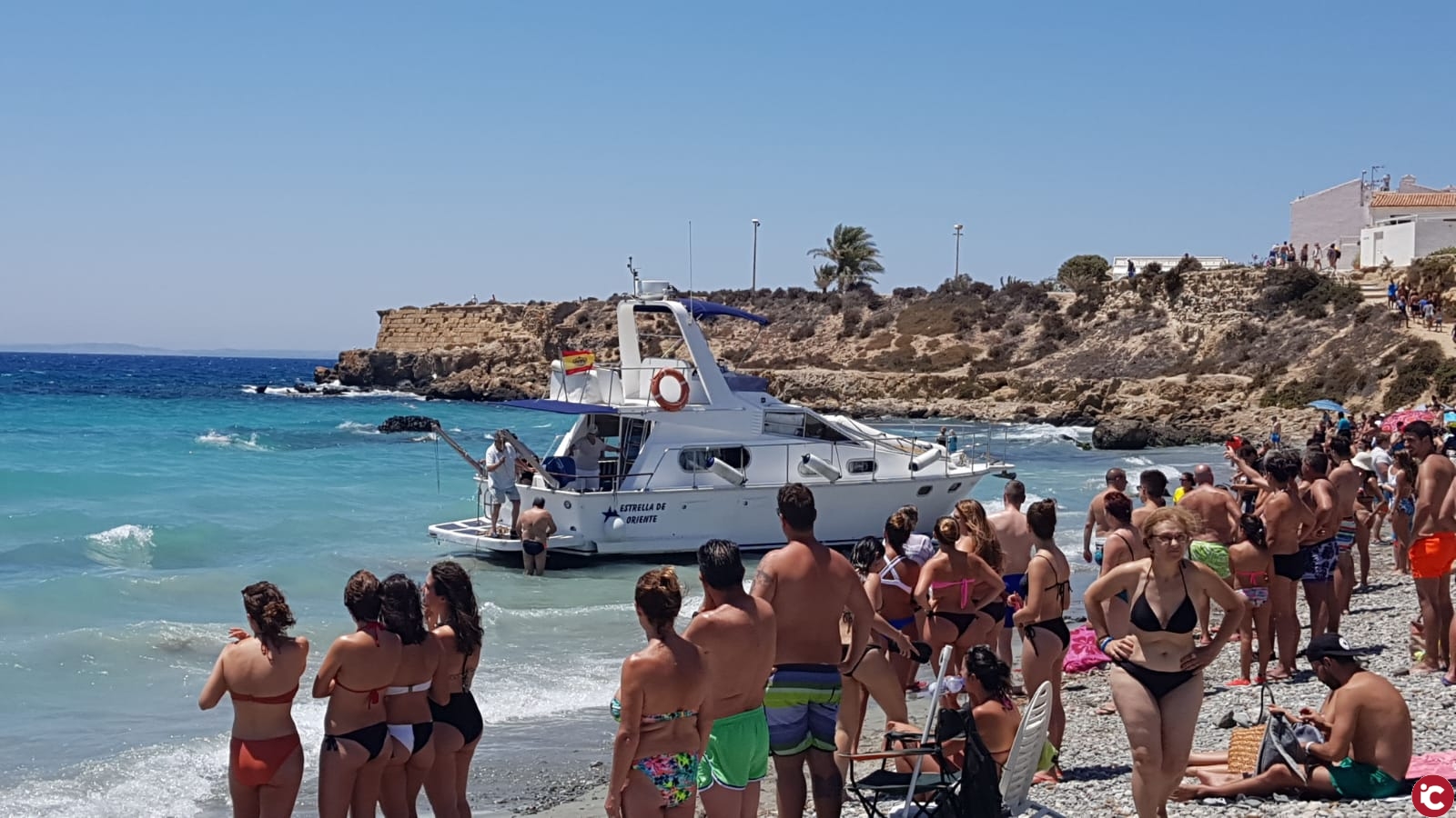 La playa de la isla de Tabarca se cierra al baño durante tres horas para realizar las maniobras de remolque y se acordona la zona donde ha quedado varada la embarcación.