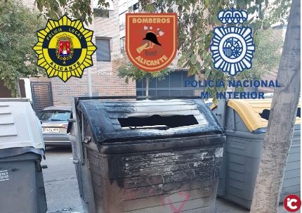 Alicante, 27 de septiembre de 2020. La concejalía de Seguridad del Ayuntamiento de Alicante informa que agentes de la Policía Local y Policía Nacional han detenido a tres personas de nacionalidad española y alemana de 17, 18 y 19 años de edad acusados de un delito de daños al presuntamente incendiar cinco contenedores y cinco papeleras en Alicante.