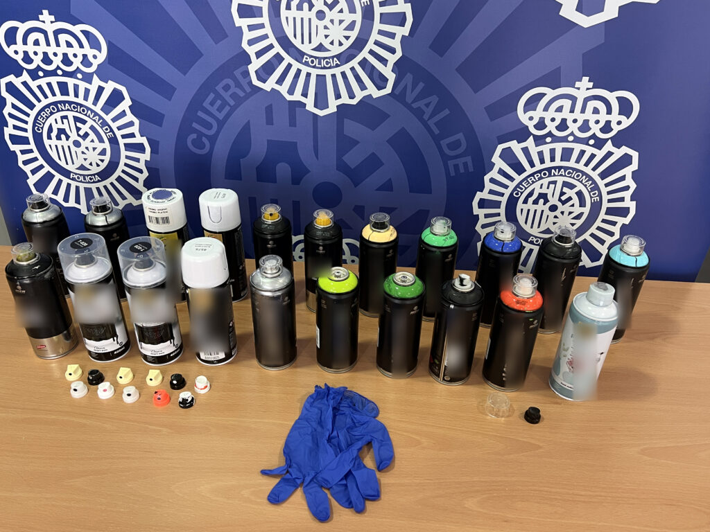 A los detenidos, se les intervino diverso material destinado a la elaboración de este tipo de pintadas, consistente principalmente en botes de spray de pintura específicos para este ilícito fin.