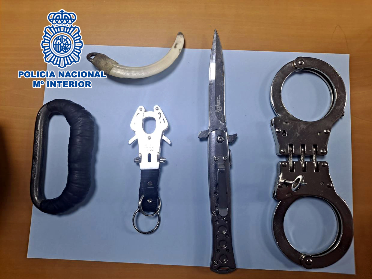 Agentes de la Policía Nacional han detenido al portero de un local de ocio nocturno de la zona de ocio del puerto de Alicante, como presunto autor de un delito de lesiones graves, tras haber golpeado a un varón que estaba causando problemas a los clientes del local, quien en el momento de su detención llevaba encima varias armas prohibidas, tales como; una navaja tipo mariposa de 23 centímetros de longitud, un puño americano envuelto en cinta aislante, un cuerno de de marfil afilado, unos grilletes con su llave y un grillete de dedos.