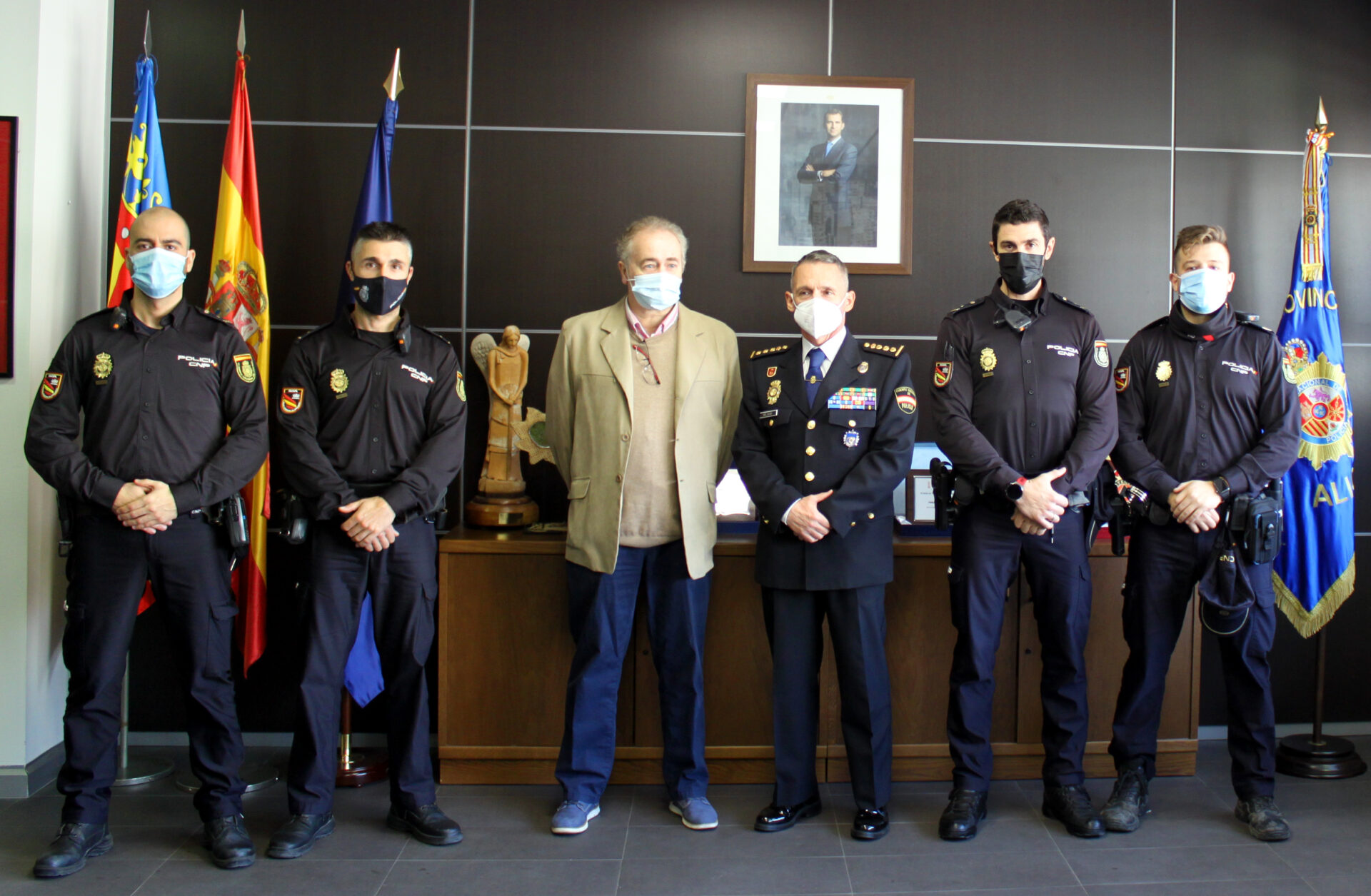 El ciudadano, quien finalmente sobrevivió al ataque cardíaco gracias a la rápida intervención policial, actualmente sigue recuperándose de la cirugía cardiovascular a la que fue sometido, se mostró muy agradecido con los agentes que le salvaron la vida, a quienes solicitó dar las gracias en persona, motivo por el que se convocó un emotivo encuentro entre los Policías actuantes y el afortunado ciudadano en las dependencias de la Comisaría Provincial de Alicante, recepción que contó con la asistencia del Comisario Principal Jefe Provincial de Alicante D. Ignacio Del Olmo donde el emocionado ciudadano pudo agradecer a los agentes su heroica labor.
