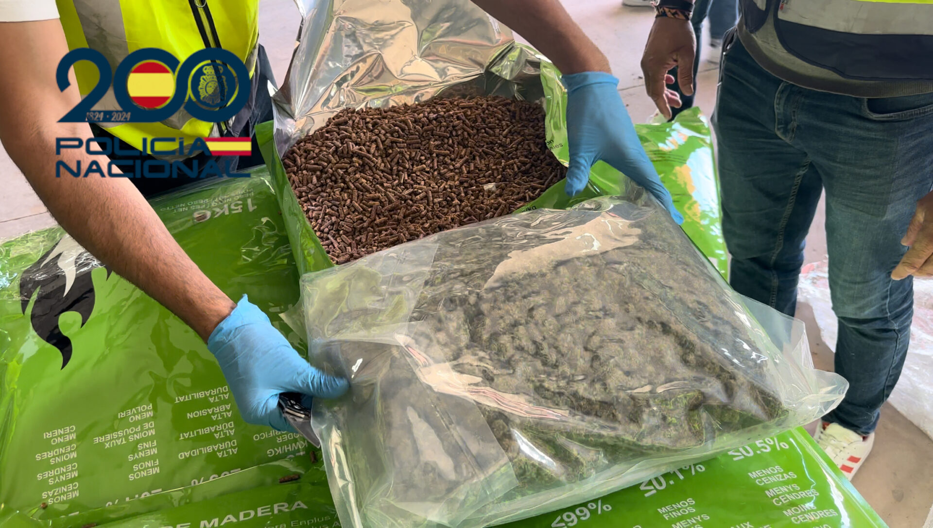 Días más tarde y en el transcurso de las vigilancias, se identificó a un camión de matrículas polacas que había llegado a la nave y que cargaba numerosos pallets en el remolque del mismo, considerando éste el momento idóneo para que los agentes procedieran a la inspección de la mercancía y al registro de la nave industrial, desembocando en la localización de 114 paquetes prensados al vacío de marihuana, ocultos en el interior de envases de pellets. Cabe destacar la argucia y el trabajo empleado por los miembros de esta organización a la hora de esconder la droga en el interior de los sacos que contenían pellets y que previamente habrían cambiado de su embase original transparente a otro completamente opaco para evitar la fácil localización de la marihuana que también introducían junto a los pellets.