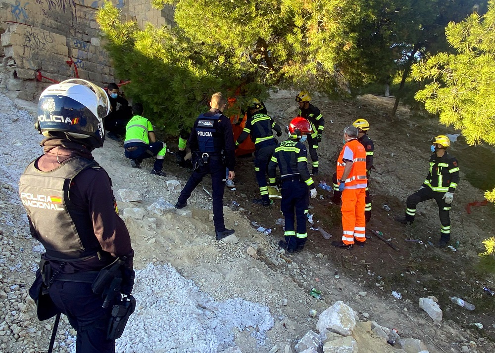 Agentes de la Policía Nacional, junto con la Unidad Adscrita de la Policía Nacional a la Generalitat Valenciana, el Cuerpo de Bomberos de Alicante y una dotación del SAMU, se coordinan para realizar un complicado rescate de una persona de 64 años de edad que se precipitó al vacío desde una altura de tres metros a una escabrosa pendiente atravesando las ramas de un árbol entre las que quedó enredado.