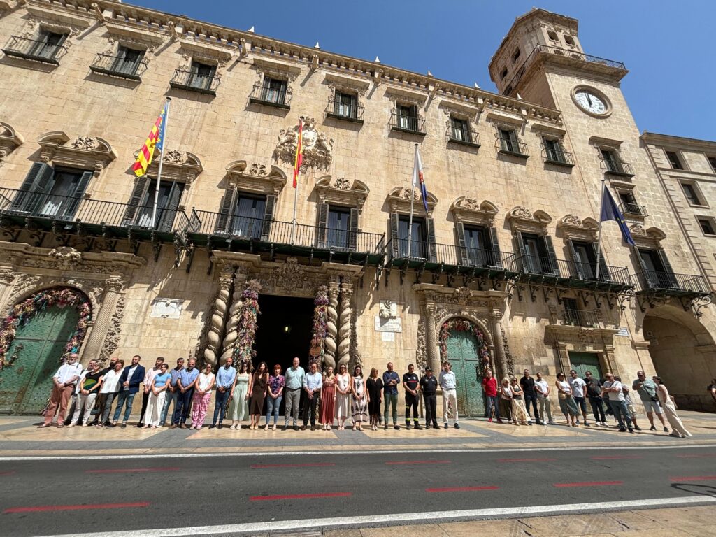 En Alicante, los representantes y funcionarios del Ayuntamiento de Alicante han guardado un minuto de silencio en las puertas del consistorio este martes al mediodía en señal de repulsa por el asesinato machista de una mujer en el municipio de Villena. La corporación municipal alicantina se suma así a la convocatoria de la Federación Valenciana de Municipios y Provincias (FVMP) para condenar este nuevo asesinato de una mujer a manos de su marido antes de quitarse este la vida y mostrar la solidaridad junto con el resto de alicantinos con la familia de la víctima. Desde el Ayuntamiento de Alicante se ha hecho un llamamiento a la colaboración de toda la sociedad a apoyar la labor que realizan los servicios sociales, así como las fuerzas y cuerpos de seguridad para combatir esta lacra social.