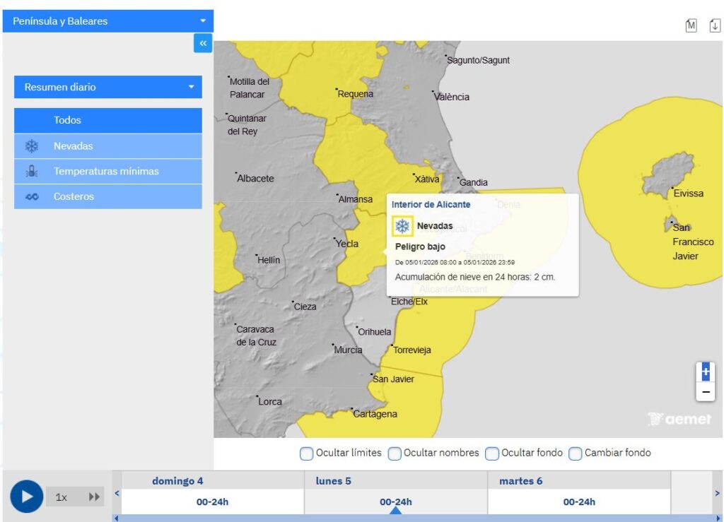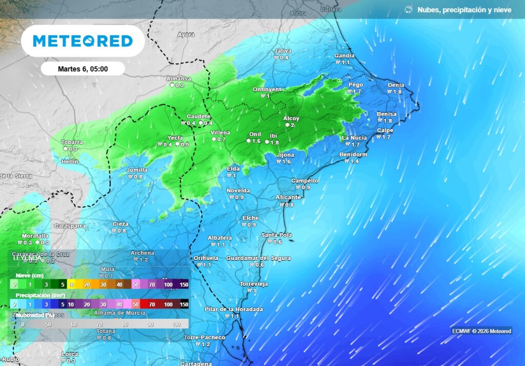 El lunes 5 de enero será el día clave para la nieve. Aunque existe incertidumbre sobre la cota exacta y los espesores —debido a la interacción entre el aire ártico y la masa húmeda previa—, AEMET señala que la nieve podría afectar al interior del norte de Alicante.